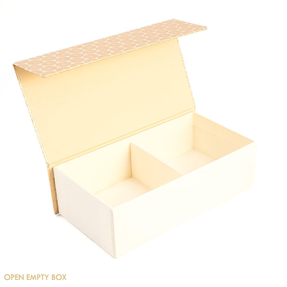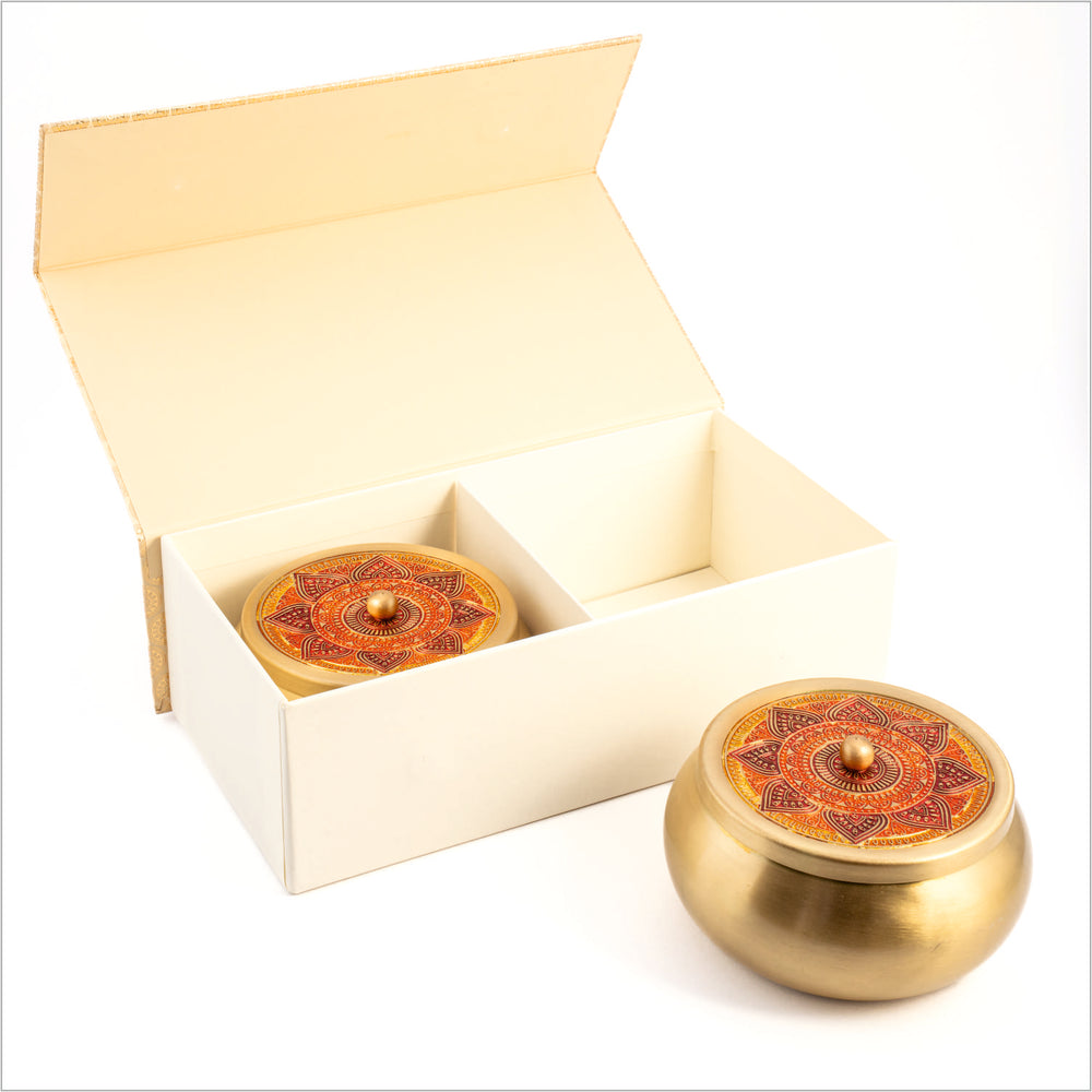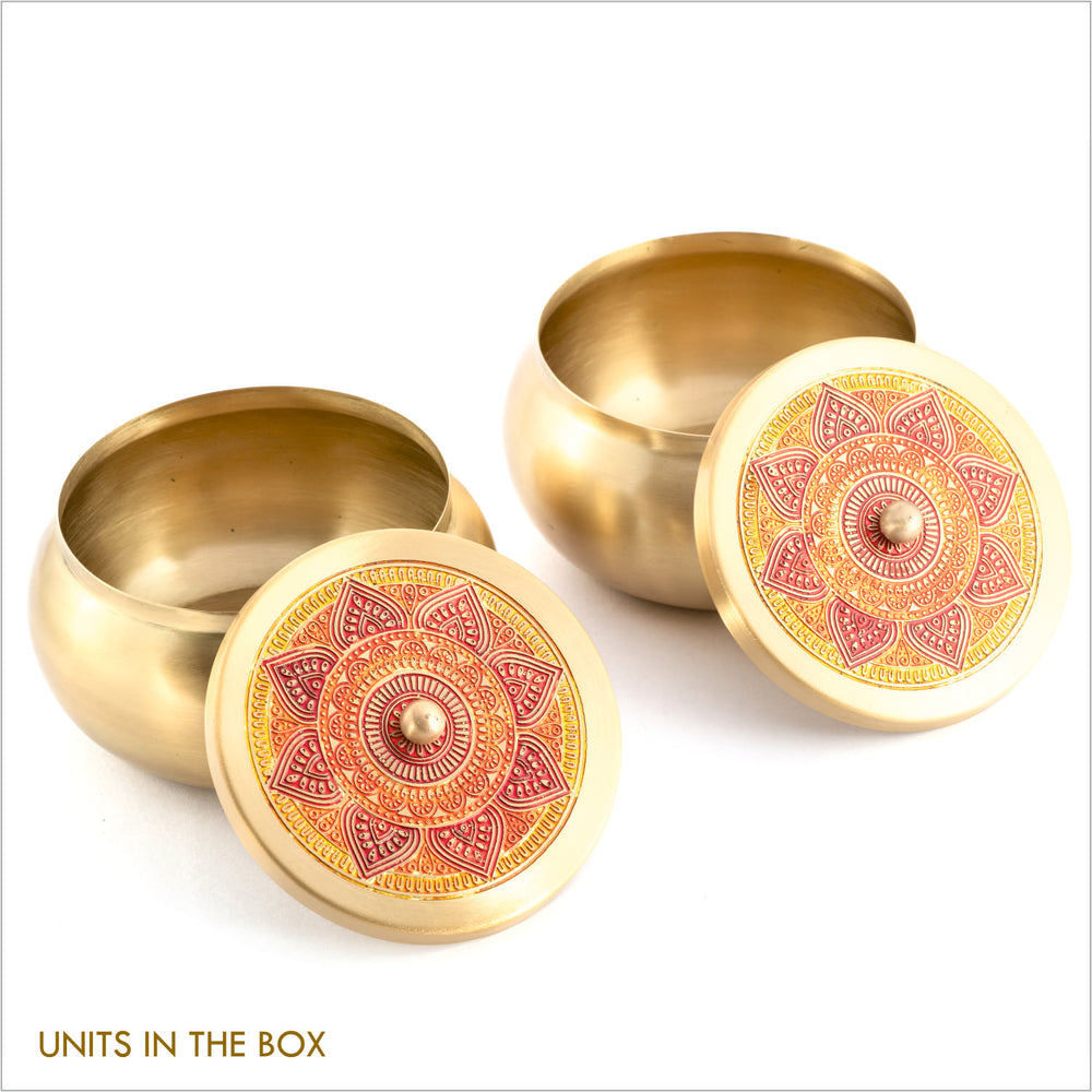 nspired by traditional Indian Kuliya shapes, this set includes two handcrafted brass containers with intricate etched detailing and festive enamel in vibrant tones. Each container can hold 450–500 grams, making it ideal for dry snacks, offerings, or decor. The design blends ancient forms with modern-day elegance, presented in a high-quality gold gift box.
