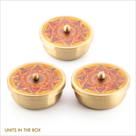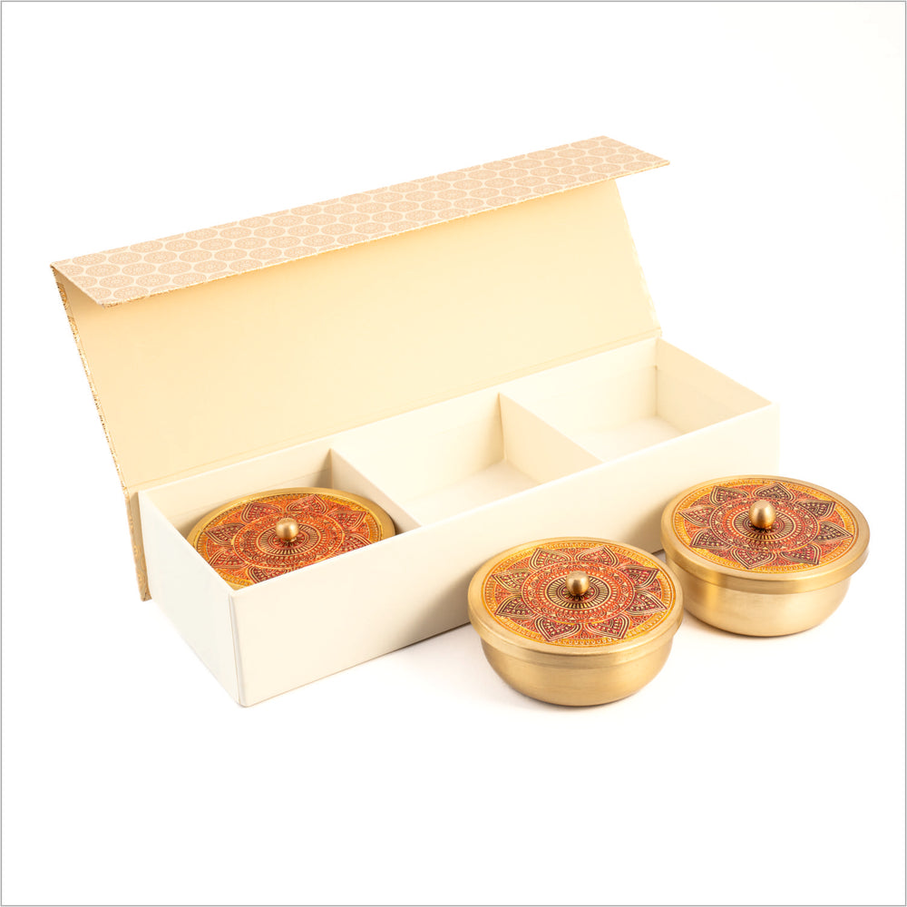 A set of three pure brass containers featuring finely etched surfaces and bright festive enameling. Each piece is a tribute to Indian craftsmanship and is perfect for storing dry fruits, sweets, or even home trinkets. The gold-gilded magnetic box enhances the product’s luxurious appeal while ensuring practicality in storage and display.