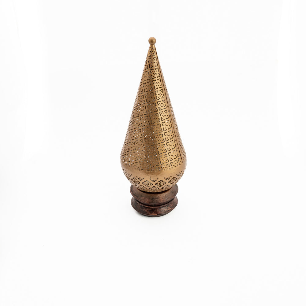 The lamp features a durable metal body that is powder coated and over-enameled in a rich antique gold finish, offering excellent resistance to corrosion and long-lasting beauty. A solid wooden base accent provides stability while adding a natural contrast to the ornate metalwork. Compact yet striking, this table light is ideal for intimate spaces and layered lighting arrangements.